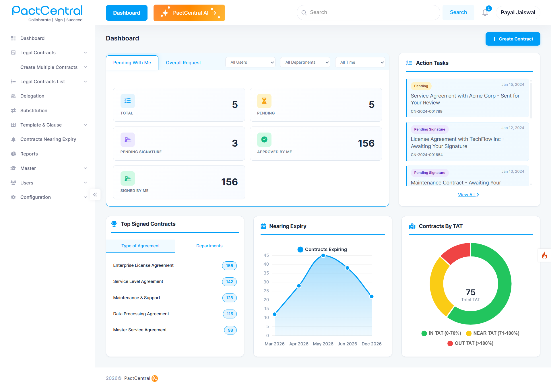 PactCentral is a unified platform for drafting, signing, tracking, and storing contracts—built to eliminate bottlenecks and empower teams with speed, visibility, and control.